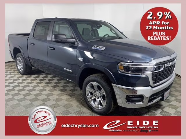 New 2026 Ram 1500 Big Horn. 2.9% APR for 72 months. LEASE AS LOW AS $409 /mo. for 39 months w/$2,999 down. 7500 miles per year. Lease based on 7500 miles for 39 months. $2999 down plus first payment due at signing. Lease Price Includes $2000 Stellantis Lease Loyalty Rebate. See dealer for details.. ZERO DOWN LEASE $489 /mo. for 39 months $489 Due @ Signing. 7500 miles per year. Lease based on 7500 miles for 39 months. First payment due at signing. Lease Price Includes $2000 Stellantis Lease Loyalty Rebate.See dealer for details.. OFF MSRP $11,070 Buy for $48,115. . Stock#: 602311. Vin: 1C6SRFFP9TN182513. MSRP: $59185. Sale ends 05/05/2026